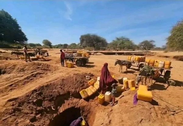 Residents of Modogashe, Isiolo North Constituency, Kenya, extracting water from deep hand-dug holes in a dry riverbed. Image source: Isiolo youth forum.